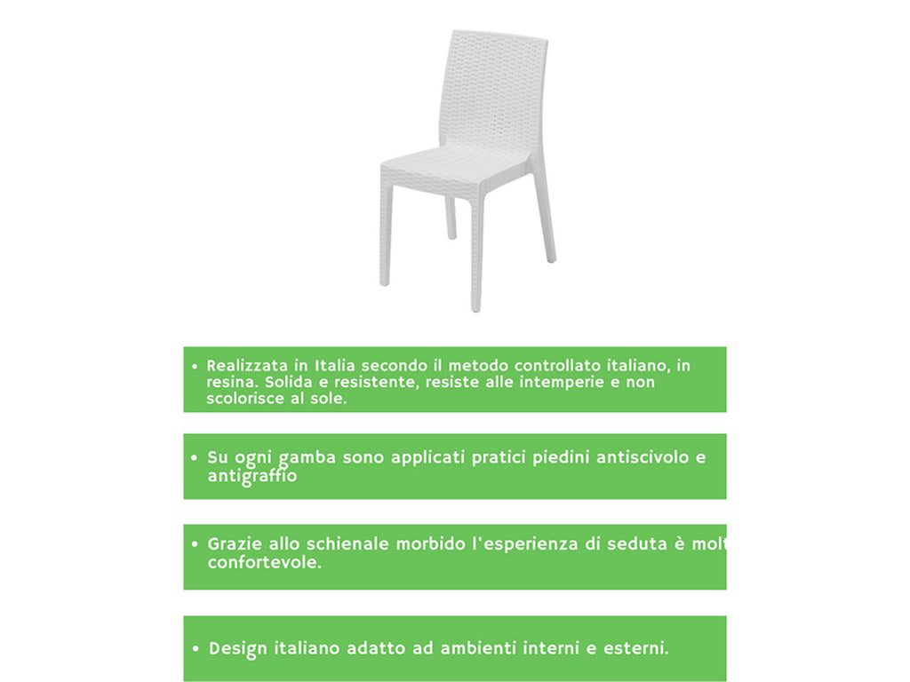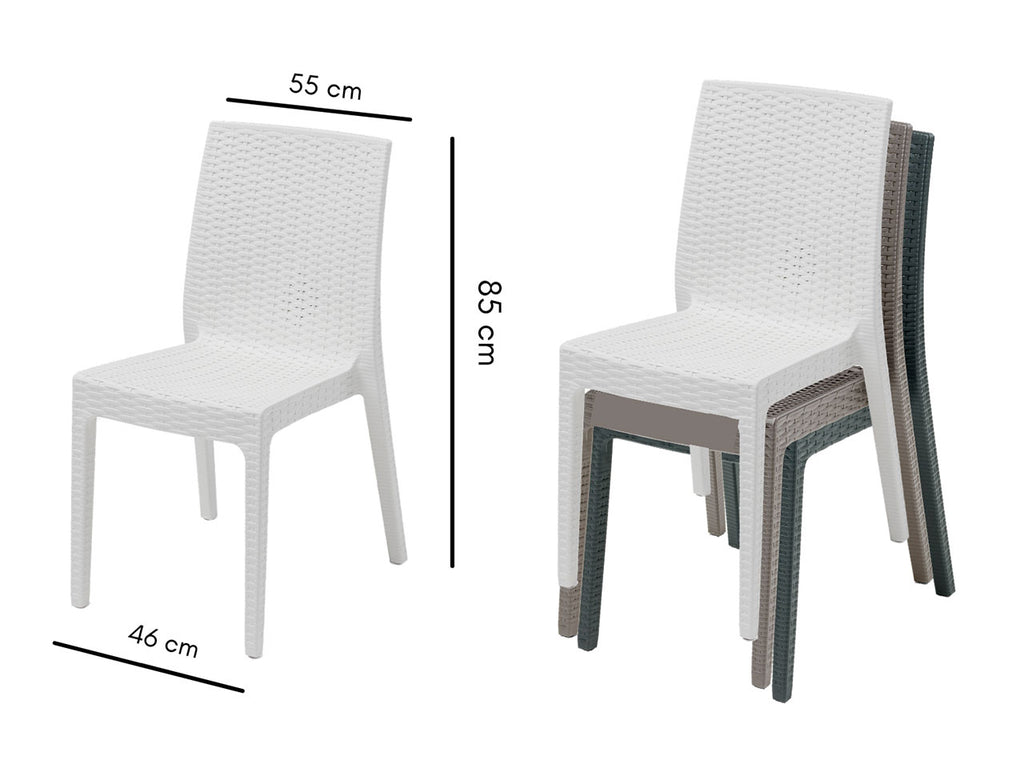 Sedia in rattan selene. una sedia realizzata in polipropilene intrecciato. le sue forme comode e funzionali lo rendono adatto a contesti outdoor e indoor. leggera e resistente, selene è accogliente e semplice nelle sue linee. con 4 piedini antiscivolo, nessuna manipolazione, resistente agli agenti atmosferici.