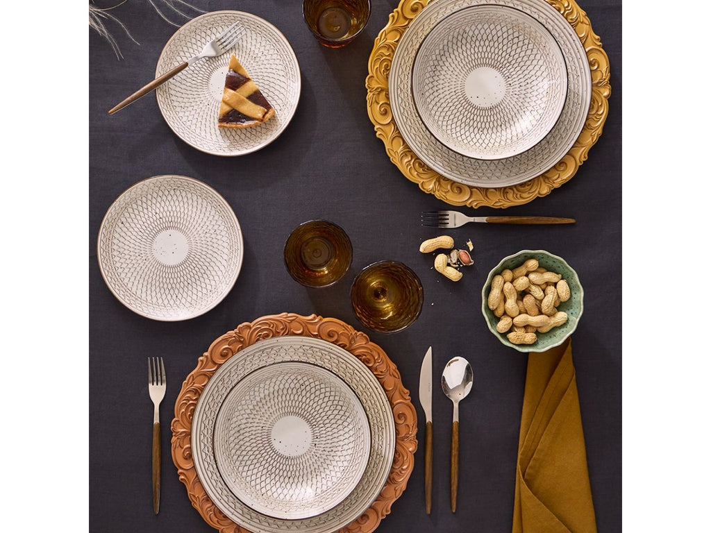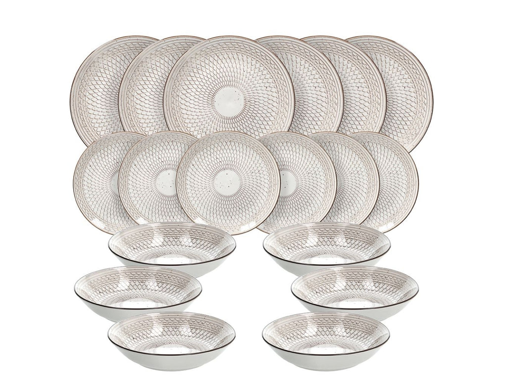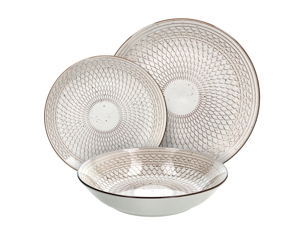 Il servizio piatti Shanty 18 pezzi in porcellana è un raffinato incontro tra design contemporaneo e ispirazioni artigianali. La decorazione geometrica, incisa con precisione e delicatezza, disegna una texture ipnotica che ricorda trame tessili o intrecci naturali, donando profondità e carattere a ogni portata. I toni neutri e sofisticati lo rendono un complemento ideale per tavole moderne ma anche per mise en place più classiche, dove si voglia aggiungere un tocco distintivo. La sua versatilità permette di utilizzarlo quotidianamente, senza rinunciare all’eleganza: perfetto per valorizzare ogni piatto, dallo stile più semplice a quello più ricercato. Realizzato in porcellana resistente e composto da 6 piatti piani, 6 piatti fondi e 6 piatti dessert, il servizio Shanty è adatto sia al microonde che alla lavastoviglie, per coniugare estetica e funzionalità in un’unica soluzione. Un’ottima scelta per chi ama curare i dettagli della tavola con gusto e originalità, lasciando spazio alla bellezza anche nei gesti di ogni giorno.