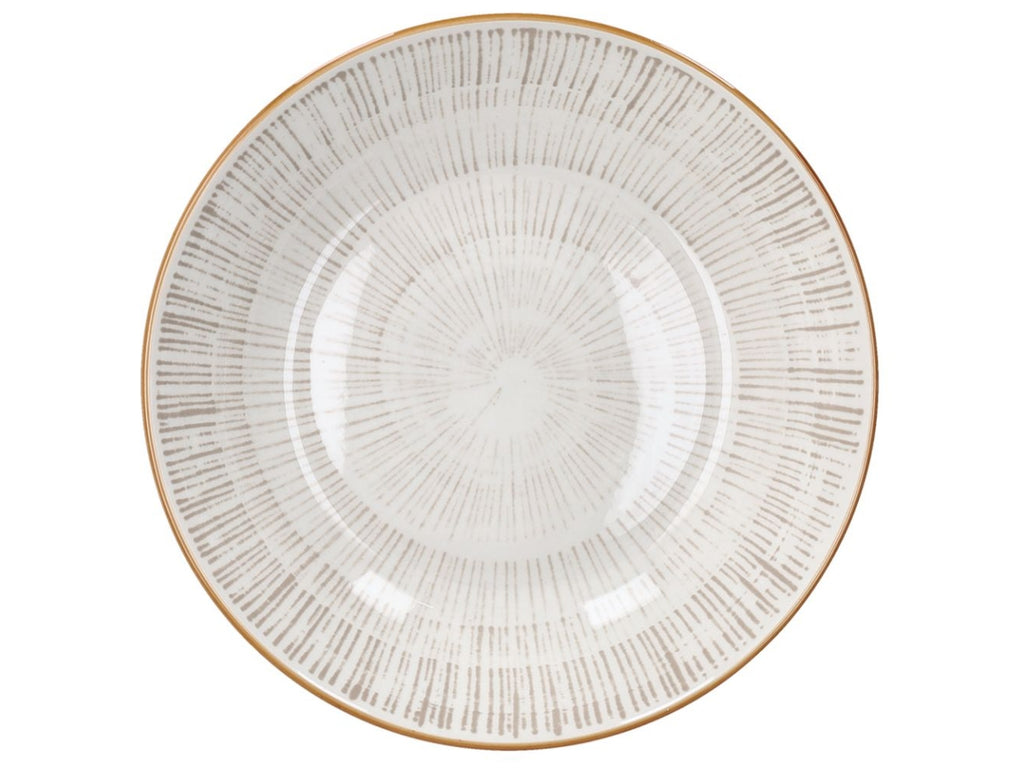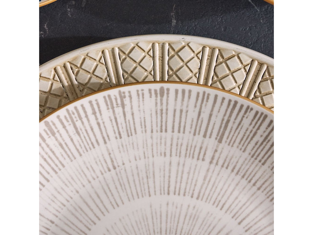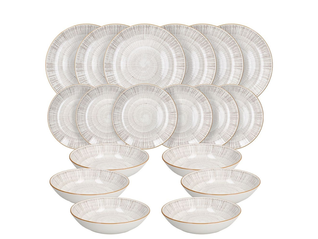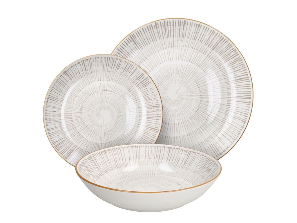 Il servizio piatti Virtuo beige 18 pezzi porta in tavola un equilibrio perfetto tra design moderno e tonalità naturali. Realizzato in porcellana e caratterizzato da un raffinato motivo grafico radiale nei caldi toni del beige, questo set unisce eleganza sobria e contemporaneità, adattandosi perfettamente sia alla vita quotidiana sia alle occasioni speciali. Il decoro delicato conferisce carattere alla tavola, rendendo l’ambiente accogliente e armonioso senza risultare eccessivo. Grazie ai materiali di alta qualità e alla praticità d’uso, il servizio è compatibile con microonde e lavastoviglie, garantendo funzionalità e resistenza nel tempo. Il servizio piatti Virtuo beige è la scelta ideale per chi cerca un servizio versatile, elegante e in linea con le tendenze d’arredo più attuali.