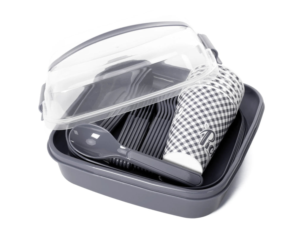 Con dimensioni di 26x26x12 cm, questo set da 31 pezzi offre tutto il necessario per godersi un pasto fuori casa.