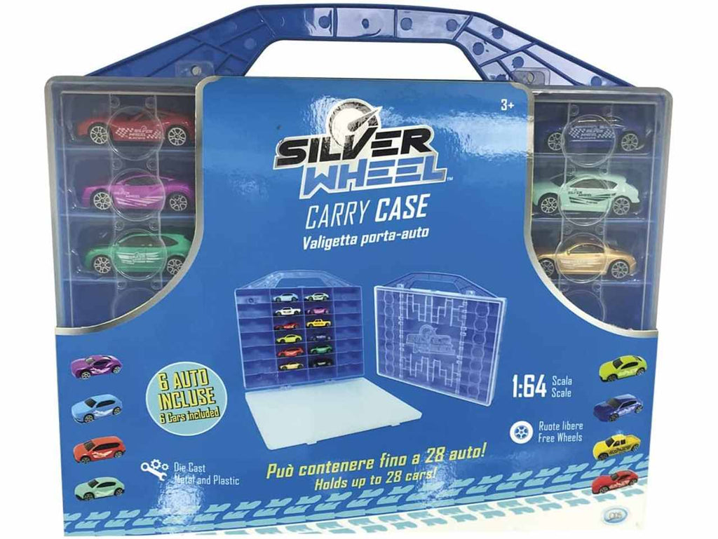 Silver wheel - valigetta cars case con 6 auto. valigetta che può contenere fino a 28 auto con 6 auto in die cast a ruote libere incluse.
