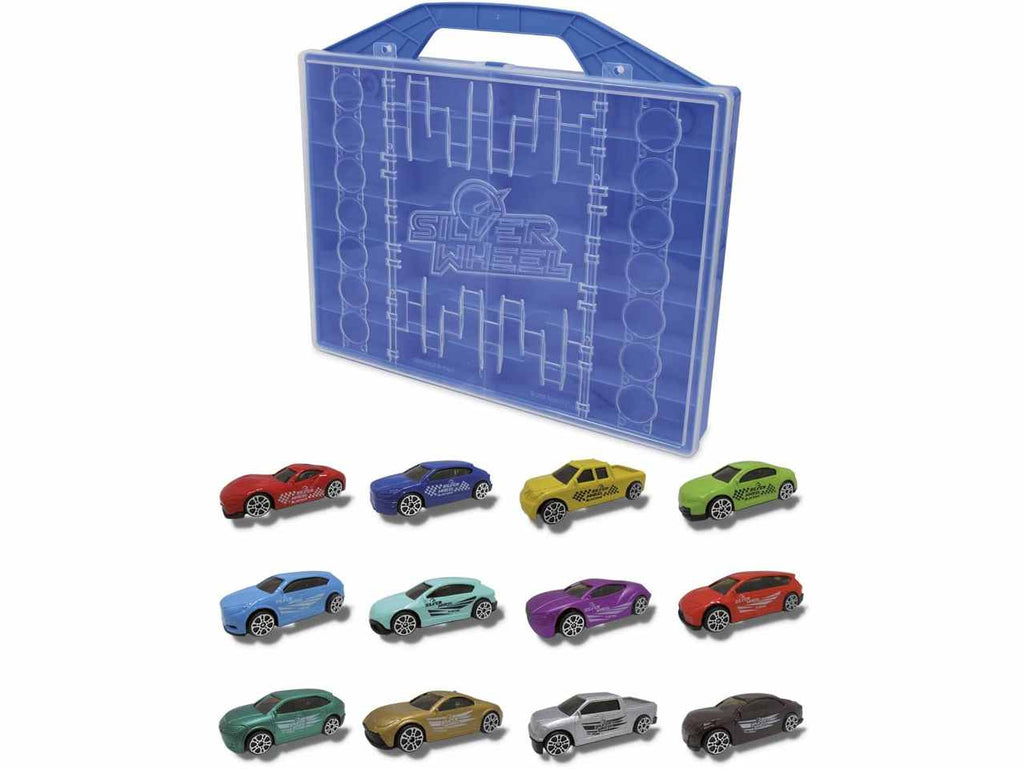 Silver Wheel - Valigetta Cars Case con 6 auto. Valigetta che può contenere fino a 28 auto con 6 auto in die cast a ruote libere incluse.,Dimensione 7 cm