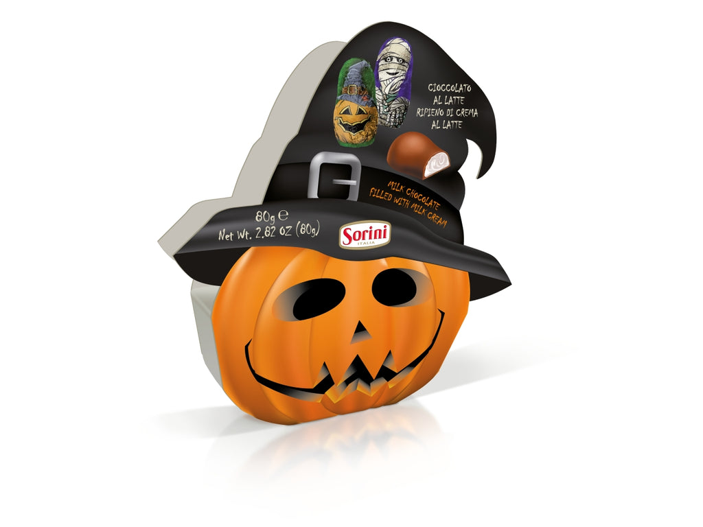 Sorini astuccio zucca 80gr con cioccolatini al latte ripieni di crema al latte