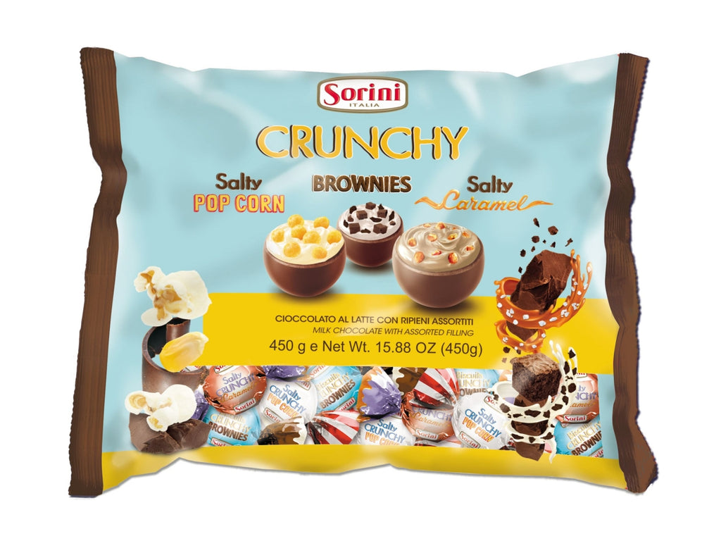 Confezione di crunchy assortite. salty crunchy caramel è stata pensata per chi ama smorzare la dolcezza del caramello con un pizzico di sale: una pralina di cioccolato al latte, ripiena di crema al caramello salato e granella croccante di caramello. provala subito! crunchy brownies una vera delizia, realizzata per soddisfare anche i più golosi: praline di cioccolato al latte, ripiene di crema al latte, con brownies e croccanti biscotti al cacao. riuscite ad immaginare qualcosa di più gustoso?! crunchy pop corn una nuova ricetta, curiosa e insolita. cioccolato al latte ripieno di crema al popcorn salato e croccanti palline di mais.un gusto che sorprende e conquista!
