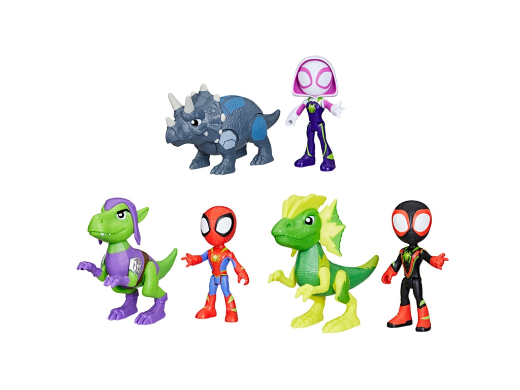 Arriva la nuova quarta stagione di Spidey e i Suoi Fantastici Amici Dino-Webs e con essa arriva anche lâassortimento degli eroi della serie con un personaggio cattivo, il tutto ispirato al nuovo contenuto! Ogni confezione include un eroe da 6 cm (Spidey, Miles e Ghost Spider), con la sua nuova tuta da dino, accompagnati da un dino cattivo della serie animata: Electro, Rhino e il cattivo Green Goblin Raptor! L'assortimento include 4 solidi di cui: Spidey con Green Goblin Raptor, Miles con Electro e Ghost-Spider con Rhino.