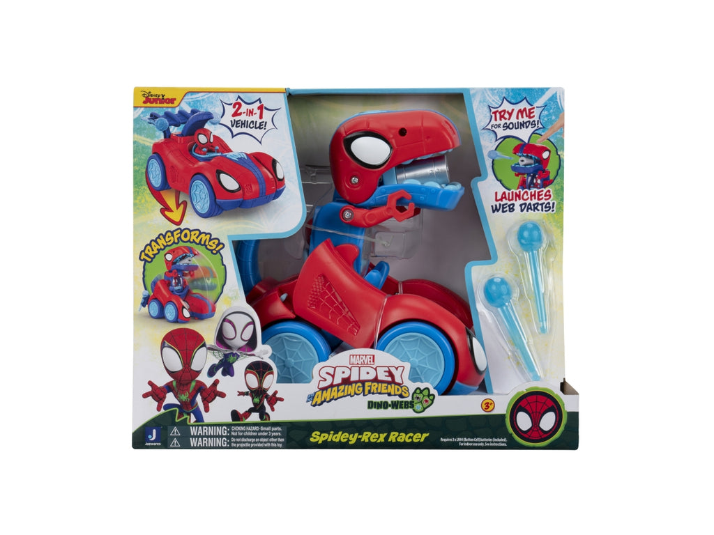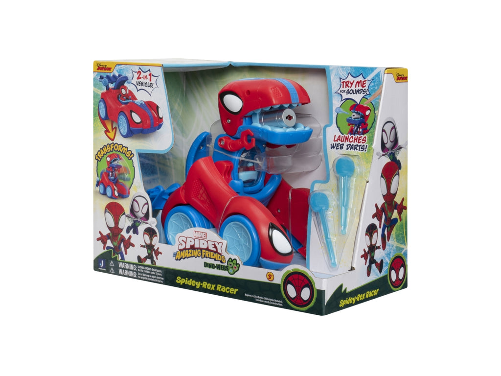 Scopri la nuova serie TV Dino Webs e il veicolo 2 in 1 di Spidey da 20 cm! Trasforma l'auto di Spidey in T-Rex Racer, completo di suoni e funzione lancia dardi. Il personaggio di Spidey non è removibile.