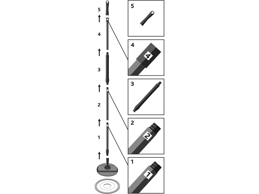- La confezione comprende 1 manico a 5 pezzi con sistema di strizzatura manuale, 1 piastra piatta rotonda, 1 secchio con centrifuga e rullo pulente, 1 panno in Microfibra.