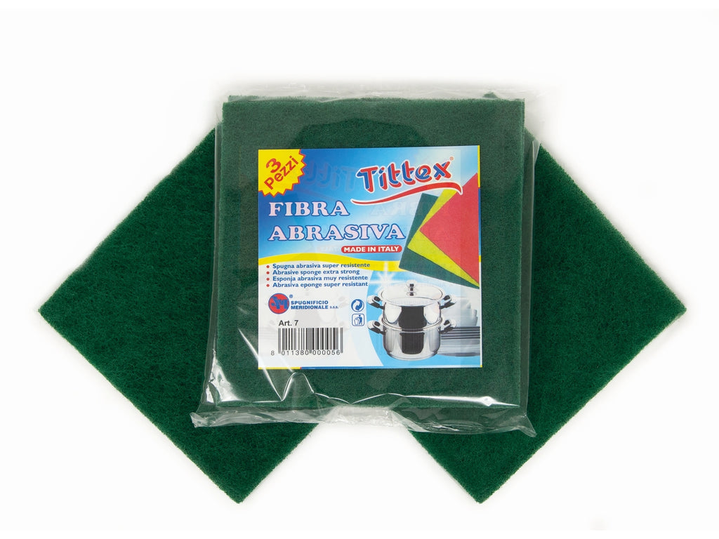 La fibra abrasiva è utile per la rimozione di incrostazioni e residui di cibo da pentole, stoviglie, griglie e forni.