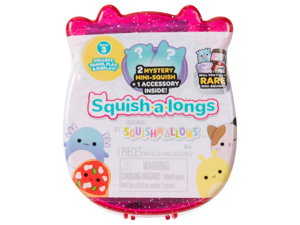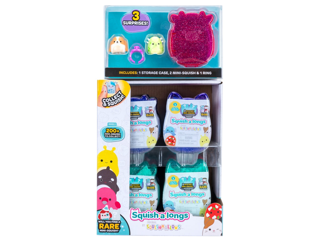Tutta la meraviglia dei personaggi Squishmallows in versione mini! Squish a longs un mix di dolcezza, design e collezionabilità! Una surprise pack con 2 personaggi da 2,5 cm, 1 anello, 1 contenitore, 1 guida alla collezione e accessori.