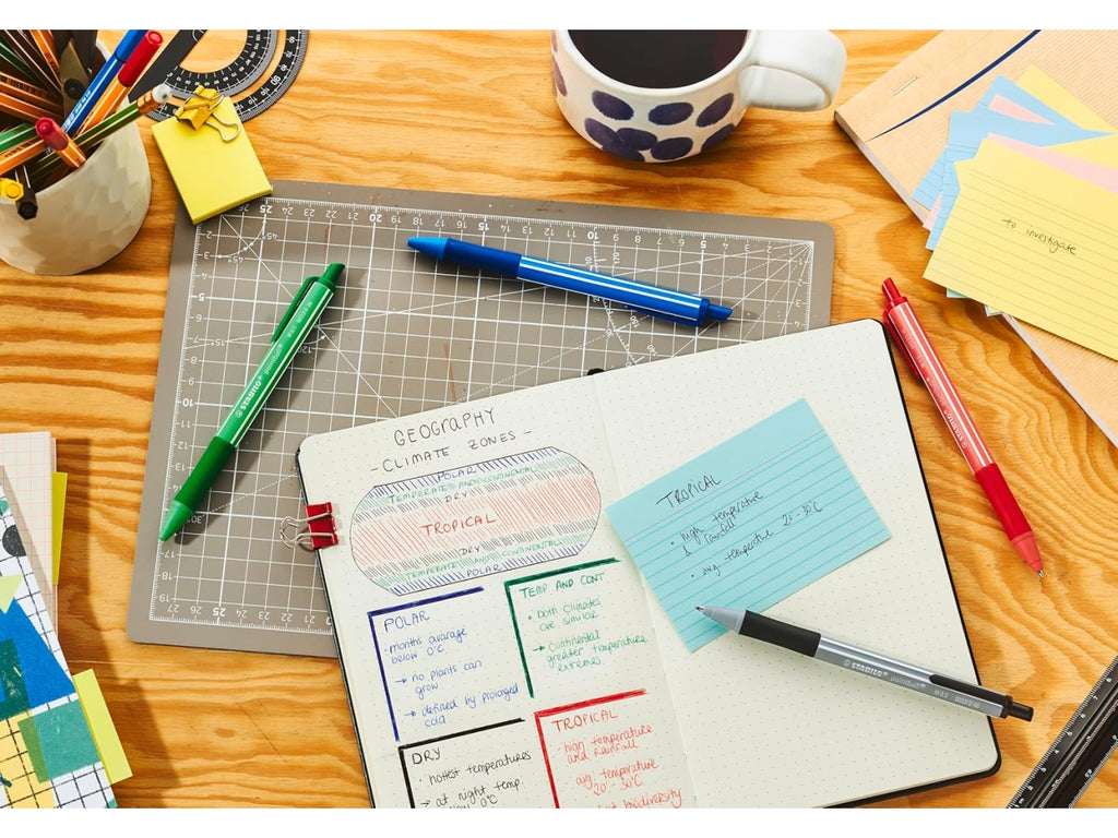 La penna a sfera a scatto ricaricabile STABILO pointball colorful è lo strumento ideale per tutti coloro che sono attenti all'ambiente. STABILO pointball è una penna realizzata in gran parte in bioplastica, per la salvaguardia dell'ambiente. Questa penna è perfetta per ogni esigenza: puoi utilizzarla a scuola o all'università, a casa o in ufficio. E' dotata di punta con tratto 0.5 mm con inchiostro super scorrevole, di una pratica clip e di una comoda impugnatura anti-scivolo per una scrittura confortevole. STABILO pointball colorful è disponibile in 4 colori di inchiostro - nero, blu, verde e rosso (di cui nero, blu e verde anti-contraffazione), ed è ricaricabile con STABILO Ballpoint Refill. STABILO opera da sempre in modo responsabile con le risorse naturali come il legno e l'acqua al fine di risparmiare energia e tutelare l'ambiente. Stiamo aumentando costantemente la quota di riciclabilità dei nostri prodotti e investiamo costantemente in impianti e processi di produzione che riducano al minimo l'impatto ambientale.