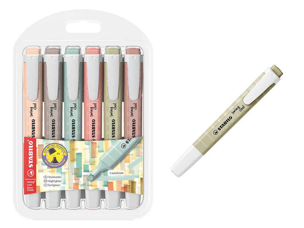 Stabilo swing cool è un evidenziatore tascabile con comoda clip perfetto per averlo sempre a portata di mano. Evidenzia le cose importanti con questo evidenziatore tascabile e alla moda, ideale per bambini, studenti e tutti coloro che viaggiano spesso. Perfetto per evidenziare in modo preciso, con la qualità Stabilo. Disponibile in diversi colori con tinte fluorescenti, pastello e natura, Stabilo swing cool ha un inchiostro a base d'acqua e 2 ampiezze di tratto: 1 + 4 mm. E' dotato di tecnologia Stabilo Anti-Dry-Out: resiste fino a 4 ore senza tappo garantendo la massima performance.