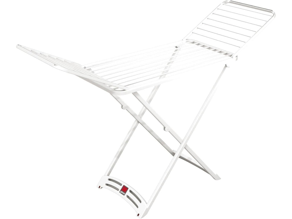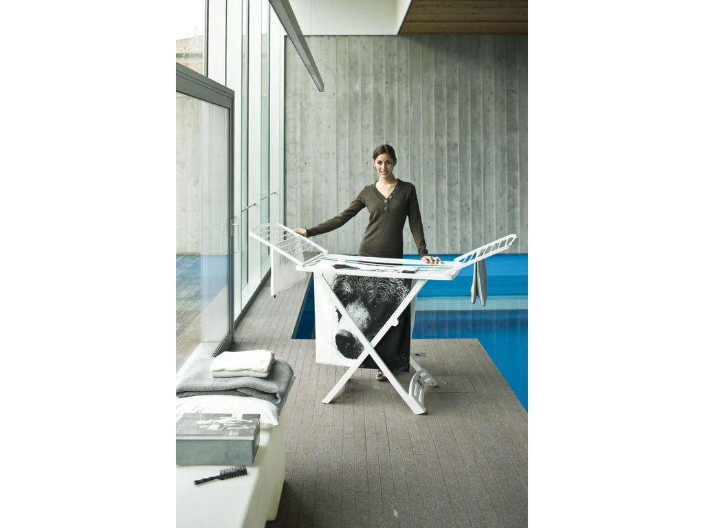 Il cavalletto in resina ben rifinito, adatto alle località di mare Stendibiancheria da pavimento a cavalletto con ruote per facilitare lo spostamento e snodo anti-chiusura accidentale con pulsante. Resistente e sicuro, è ideale per esterno.