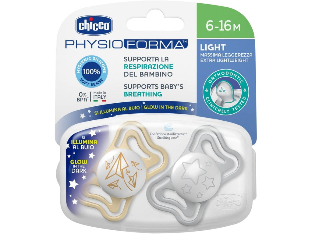La PhysioForma del succhietto Chicco è studiata per supportare la respirazione fisiologica del bambino. Aiuta a posizionare correttamente la lingua, mantenendo le vie aeree aperte per una respirazione naturale e facilitata.