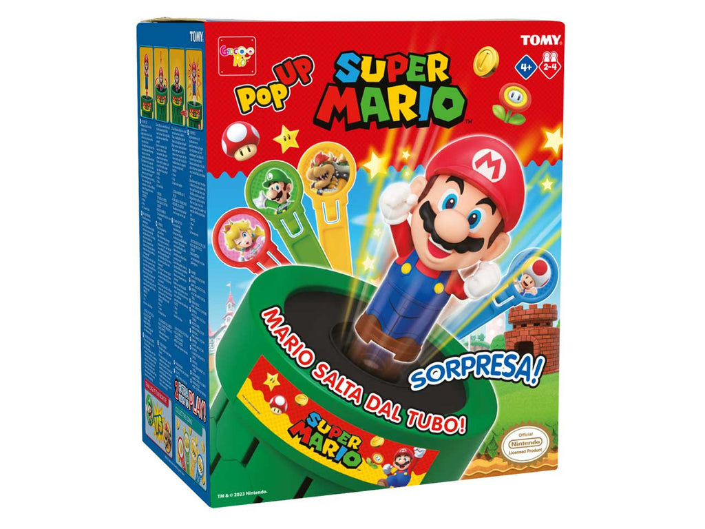 Gioco da tavolo per bambini dai 4 anni in su. Il classico Pirata Pop-Up in una versione inedita, a licenza Super Mario! A turno, infilate i bastoncini nel tubo vince il giocatore che fa saltare Super Mario fuori dal tubo! Tre modalità di gioco: sfida classica, squadra di Luigi VS squadra di Bowser e raccolta delle monete.