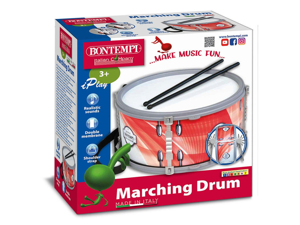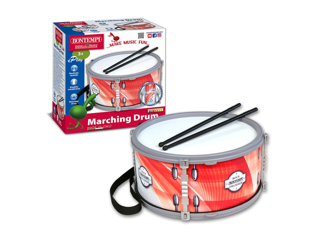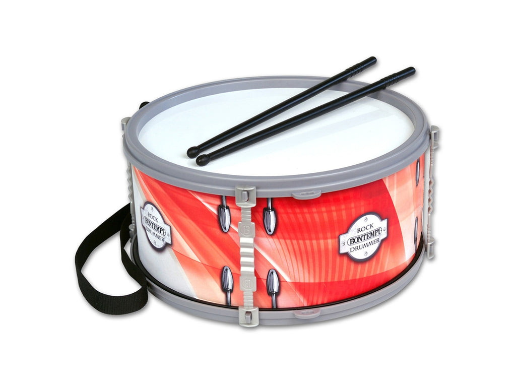 Tamburo con tracolla completo di bacchette, doppia membrana ã 250 mm, suono realistico. dimensione 250x250x120 mm.