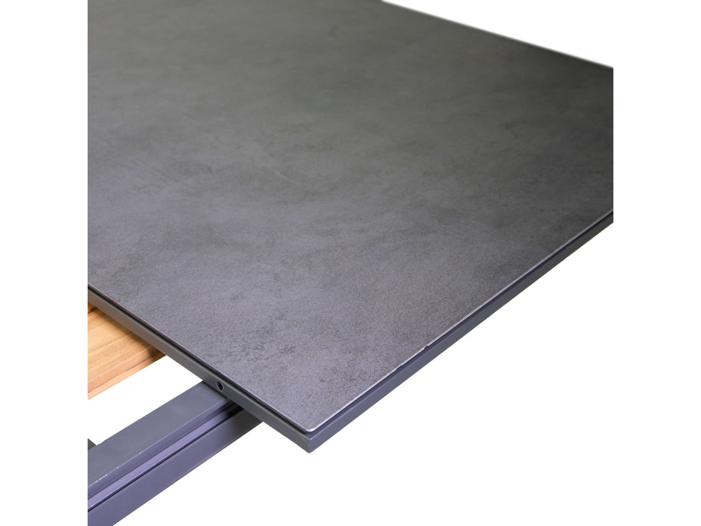 Tavolo allungabile "Honolulu" in alluminio, con finiture in antracite e un top combinato in vetro e teak, che offre versatilità e stile per qualsiasi spazio esterno o interno. Il tavolo "Honolulu" si distingue per la sua struttura allungabile in alluminio, verniciato a polvere in un elegante colore antracite che non solo aggiunge un tocco di modernità ma garantisce anche resistenza e durabilità contro gli elementi. Le dimensioni del tavolo vanno da 180 cm a 240 cm di lunghezza, con una larghezza costante di 100 cm e un'altezza di 76 cm, rendendolo ideale per accogliere comodamente da 6 a 8 persone. Il top del tavolo è un punto di forza distintivo: combina il vetro temperato di 5 mm di spessore con eleganti inserti in teak. Il vetro temperato è noto per la sua resistenza e sicurezza, essendo trattato per aumentare la sua forza e resistenza agli urti, mentre il teak aggiunge un tocco di calore naturale e sofisticatezza, rendendo ogni tavolo unico nel suo genere. Questa combinazione di materiali non solo rende il tavolo visivamente attraente ma anche estremamente funzionale, adatto sia per l'uso interno che esterno grazie alla sua capacità di resistere a variazioni climatiche. Il sistema di allungamento è progettato per essere semplice e robusto, permettendo di modificare le dimensioni del tavolo con facilità . In sintesi, il tavolo "Honolulu" rappresenta una soluzione pratica ed elegante per chi cerca un mobile versatile e resistente, capace di adattarsi a diverse necessità e contesti, mantenendo un'estetica di alto livello.