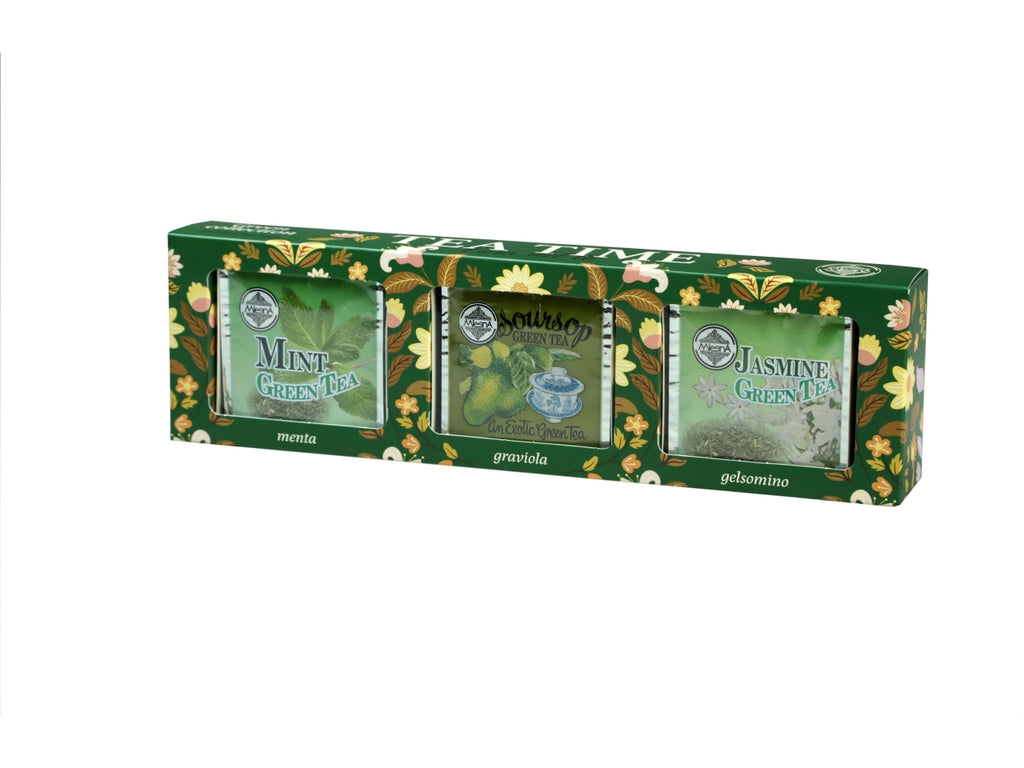 Tris tè verdi di Ceylon in filtro salvaroma; 24 filtri x 2 gr assortiti in 3 gusti: tè verde alla menta, tè verde alla graviola, tè verde al gelsomino