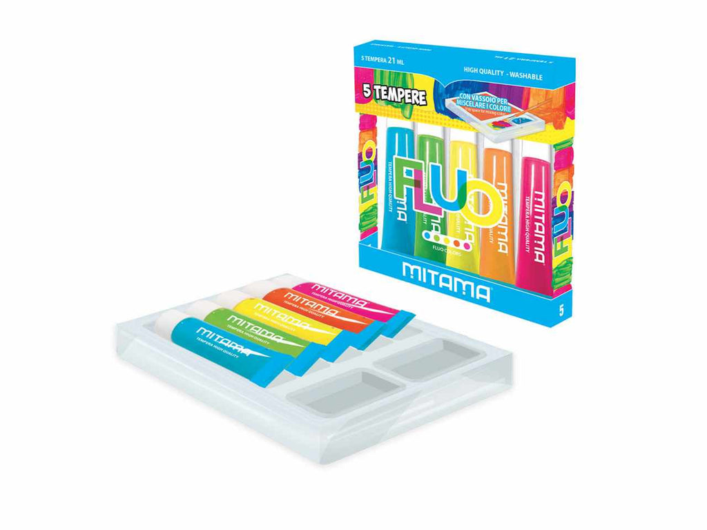 Tempera Piu', Lavabile, 5 Colori Fluo 21 ml +2 Pennel.Omaggio, Bl. 5 pz