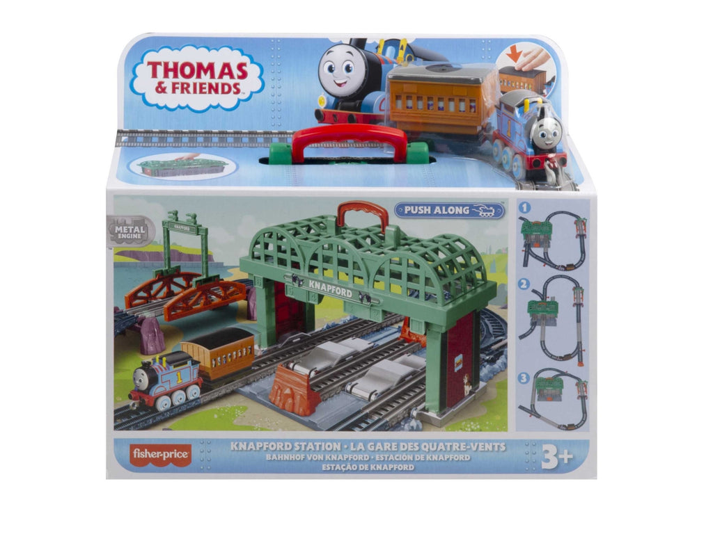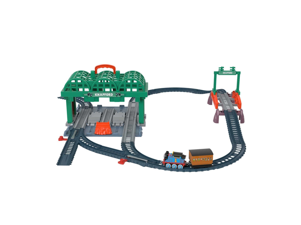 Con il playset Stazione di Knapford Il Trenino Thomas⢠da Fisher-Price con pista e trinino la stazione di Sodor prende vita. I bambini possono premere il tettuccio della carrozza passeggeri per 'far salire a bordo' i viaggiatori prima che la locomotiva a spinta Thomas parta sui binari. Questa pista riconfigurabile include 23 pezzi di binari un sottopassaggio e un ponte su cui i piccoli macchinisti possono spingere Thomas. E quando il gioco finisce basta chiudere le porte della stazione trasformandola in una valigetta per riporre i 26 pezzi. La maniglia sulla parte superiore permette ai bambini di portare le loro locomotive preferite e la pista dove vogliono (piste veicoli e accessori aggiuntivi tutti in vendita separatamente secondo disponibilità ).