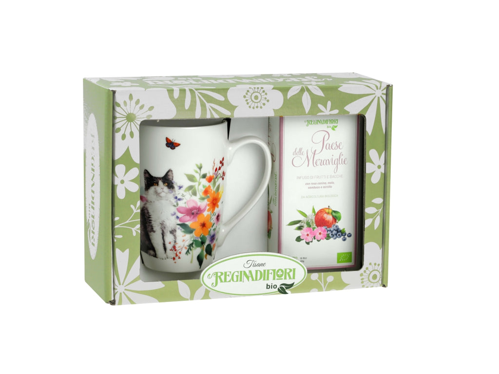 Scatola vetrina con Mug in porcellana e tisana biologica Paese delle Meraviglie 15 filtri x 3 gr. Un infuso fantasioso, ricco di frutti e bacche di bosco dalle proprietà rinforzanti e tonificanti, per affrontare ogni giornata come un’avventura meravigliosa!