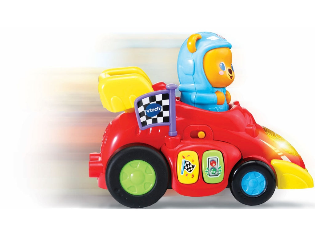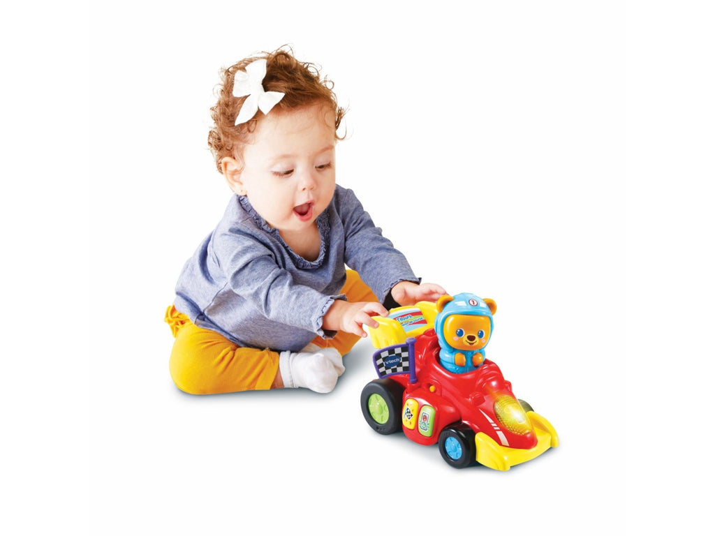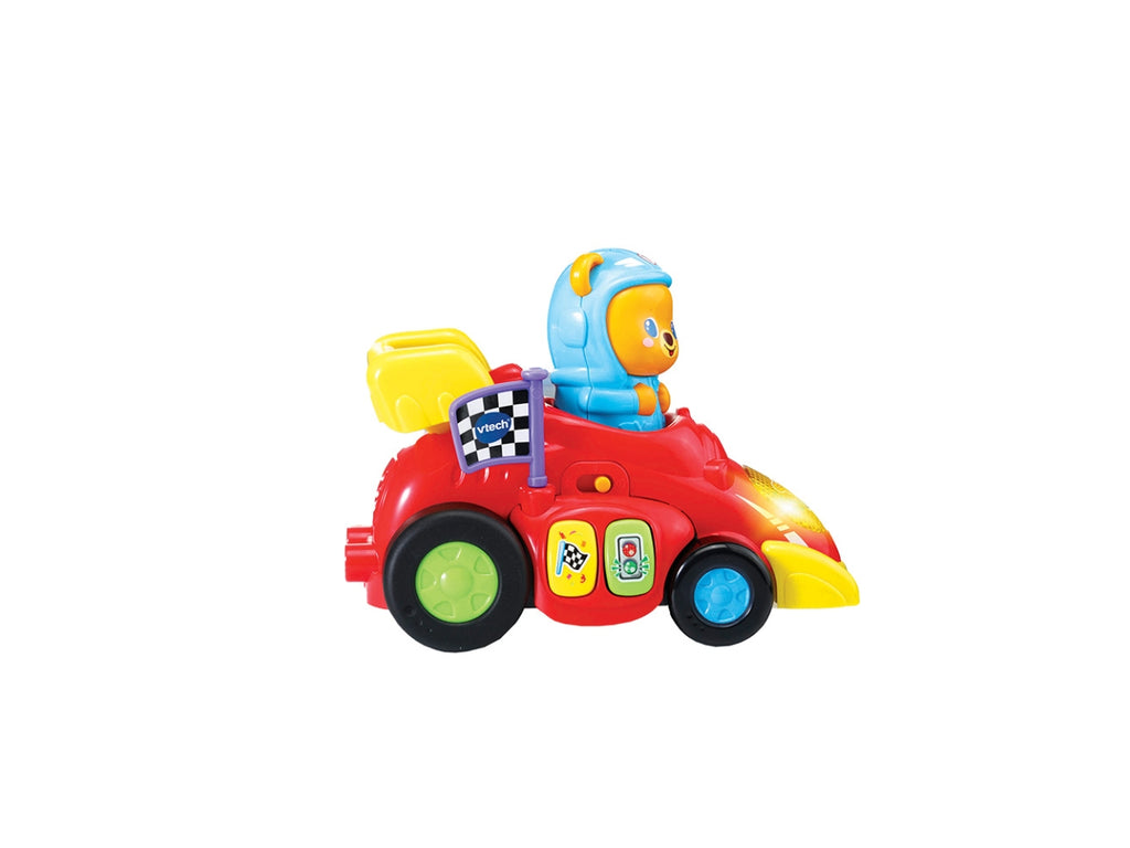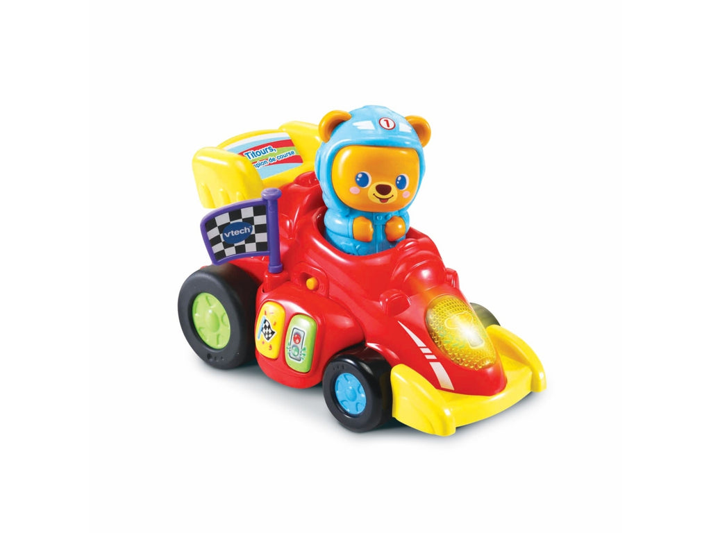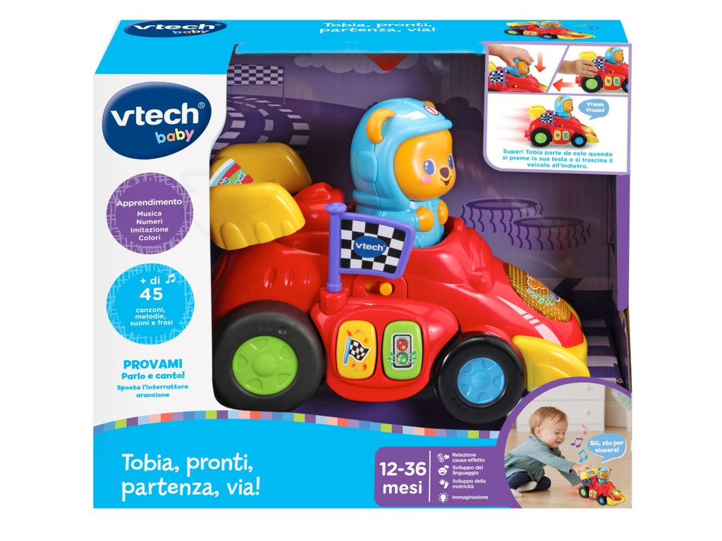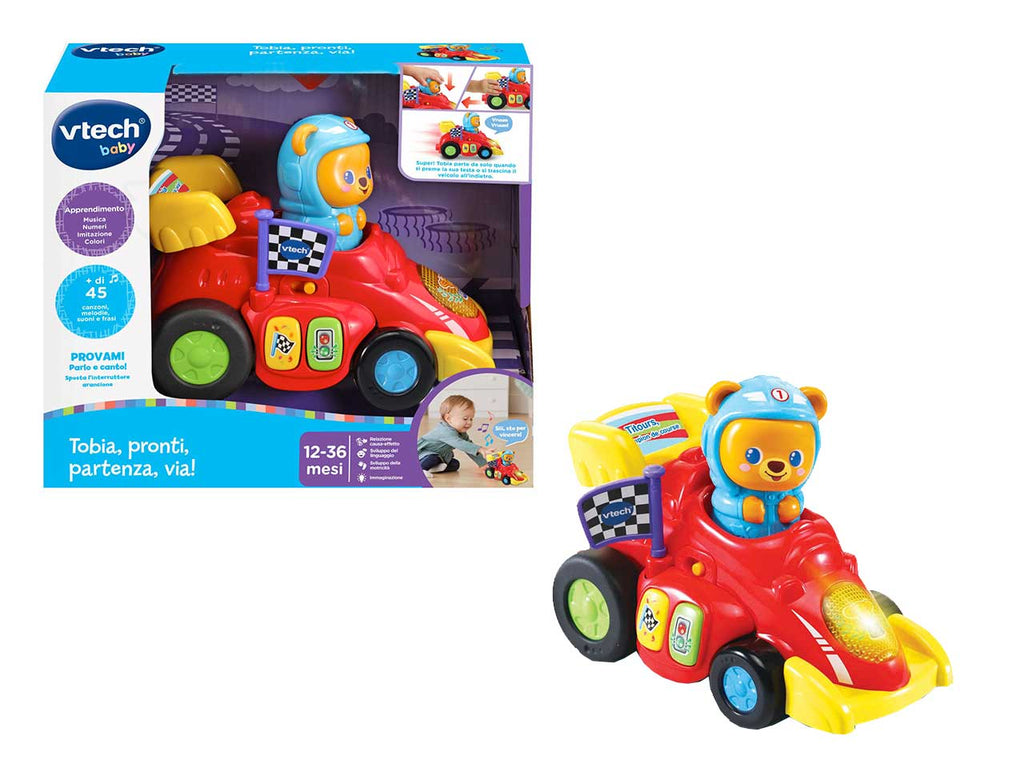Veicolo interattivo con 2 pulsanti colore per scoprire i colori, luniverso delle gare e ascoltare delle simpatiche melodie e dei suoni divertenti. Bandiera a scacchi da far girare per stimolare la motricità fine del tuo bambino. Un faro luminoso che si illumina al ritmo dei suoni e delle melodie. 2 modalità di partenza: premi la testa di Tobia o caricalo trascinando il veicolo allindietro per farlo partire e muoversi da solo. Più di 45 canzoni, melodie, frasi e suoni. 3 canzoni e 15 melodie. Regolazione del volume e spegnimento automatico. Scatola Try Me