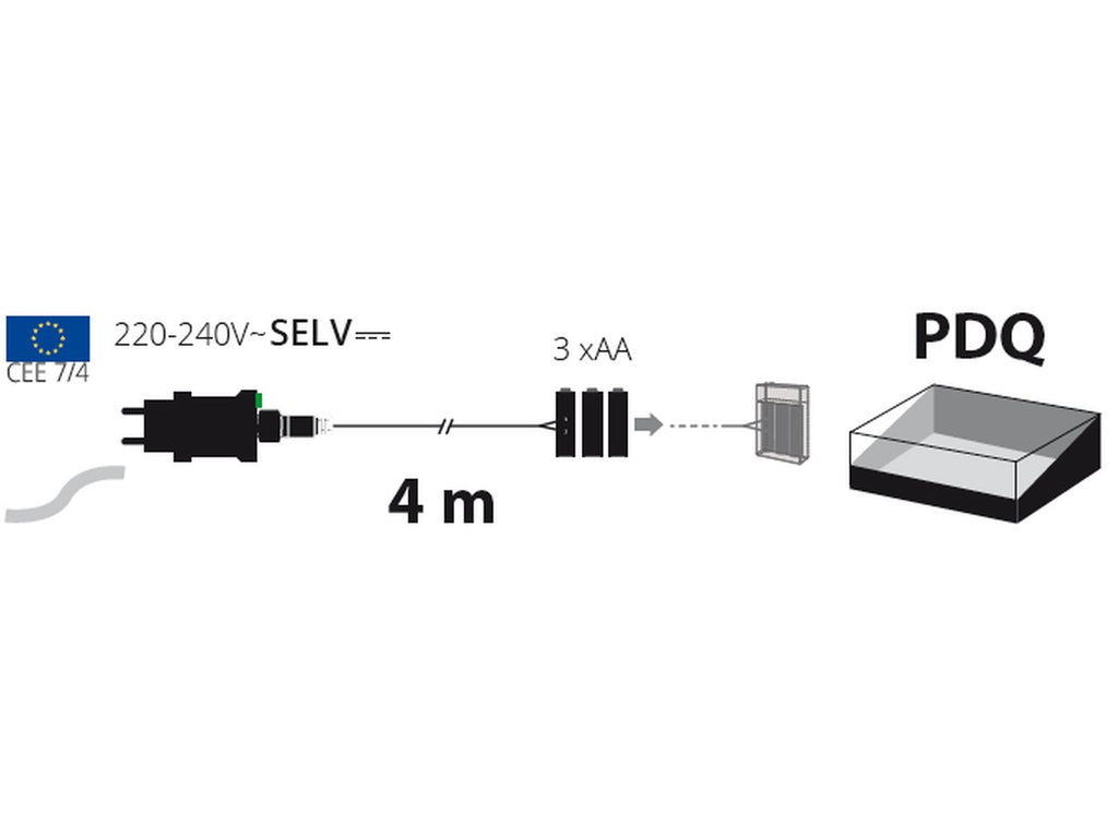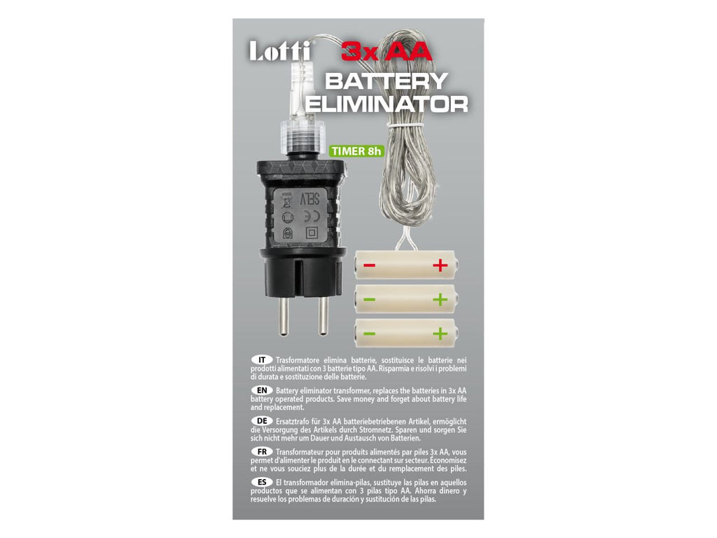 Trasformatore opzionale battery eliminator per prodotti a batteria 3x aa, consente di alimentare il prodotto collegandolo alla rete elettrica (senza l'impiego di batterie), trasformatore selv di sicurezza con timer 8 ore on (16 ore off) disinseribile tramite pulsante luminoso, spina europea shuko cee 7/4, uso interno, cavo alimentazione 4m trasparente, scatola color ed espositore pdq (xkc art. tr-fb 3xaa pdq).