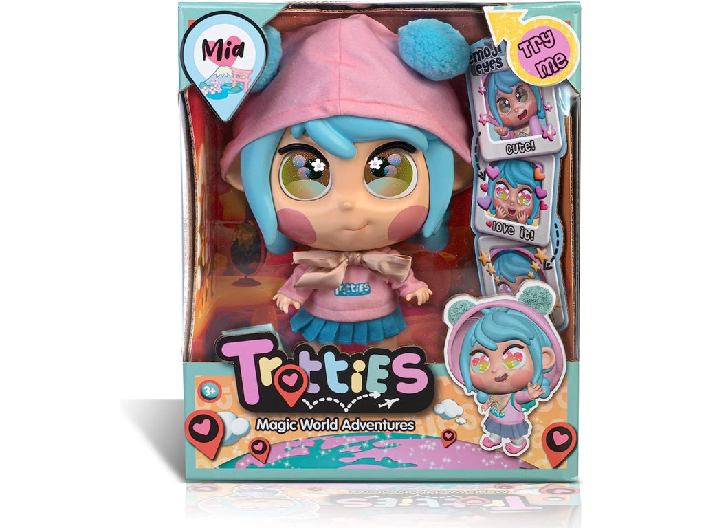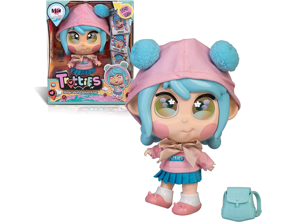 Trotties - mia, bambola trottie da tokyo, bambola della serie di cartoni animati, bambola con accessori: uno zaino e una mappa, per bambine e bambini dai 3 anni.mia da 25 cm, ama tokyo sopra ogni altra cosa. e piena di empatia e gentilezza, ama connettersi con la natura mentre pratica yoga; il suo superpotere è riuscire a comprendere qualsiasi essere e creatura, reale o fantastica, del mondo. vestita con un look romantico che include un maglione rosa decorato con un fiocco beige e un cappuccio con pompon blu in tinta con i suoi capelli; l'outfit è completato da una gonna a pieghe e uno zaino per viaggiare;include uno zaino per viaggiare e un passaporto.