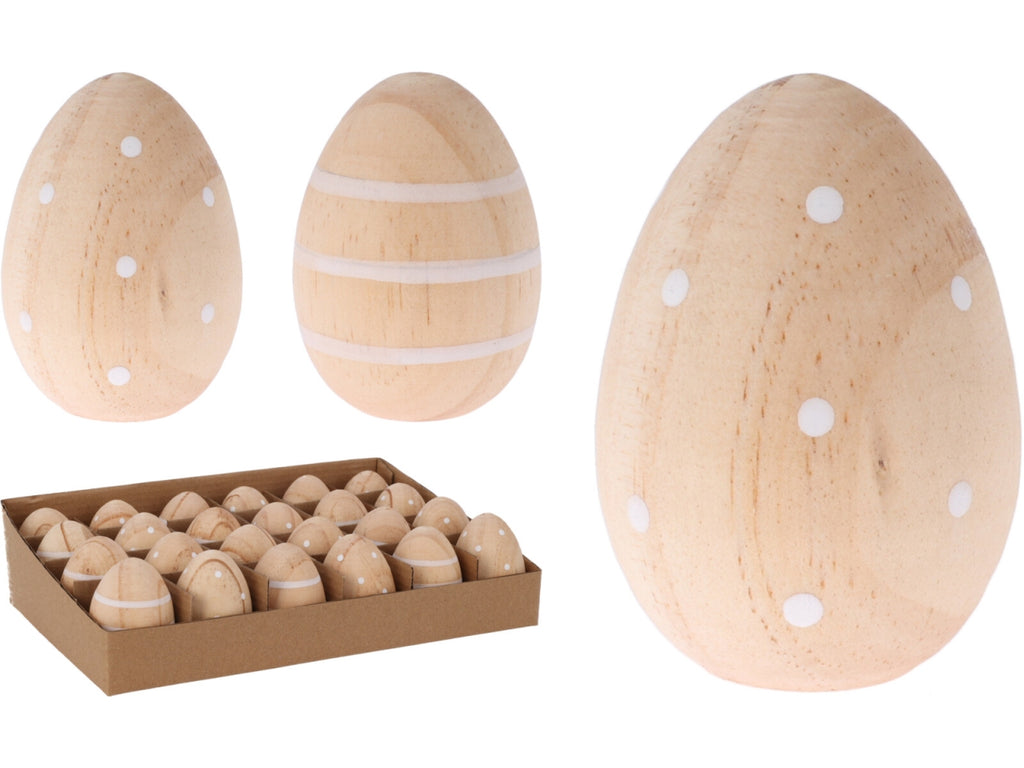 Uovo decorativo in legno di dimensioni: 4x4x5cm. 2 design assortiti, colore naturale. 24 pz per display.
