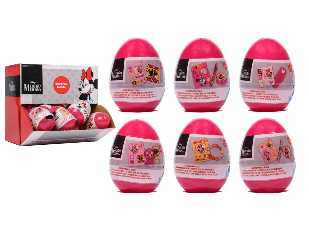 Uovo sorpresa di minnie contenente divertenti oggetti di cancelleria (adesivi, pennarelli, gomme da cancellare, matite, timbri).
