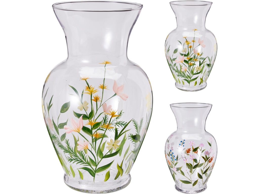 Vaso in vetro con decorazione floreale, dimensioni: 16x16x27cm, colore trasparente con 2 stampe floreali assortite.