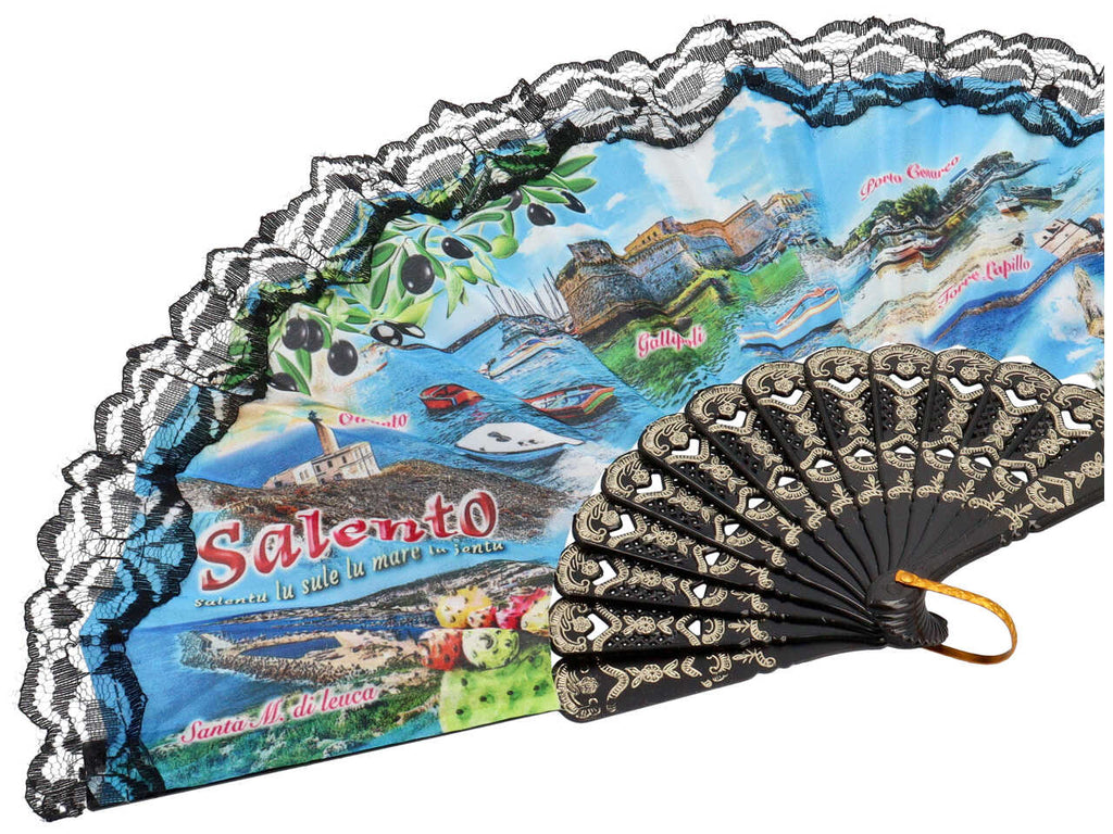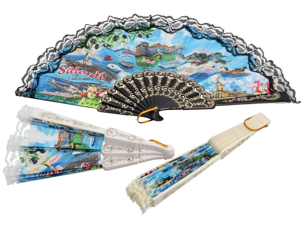 Ventaglio souvenir in tessuto con manico in plastica. Diametro cm 42