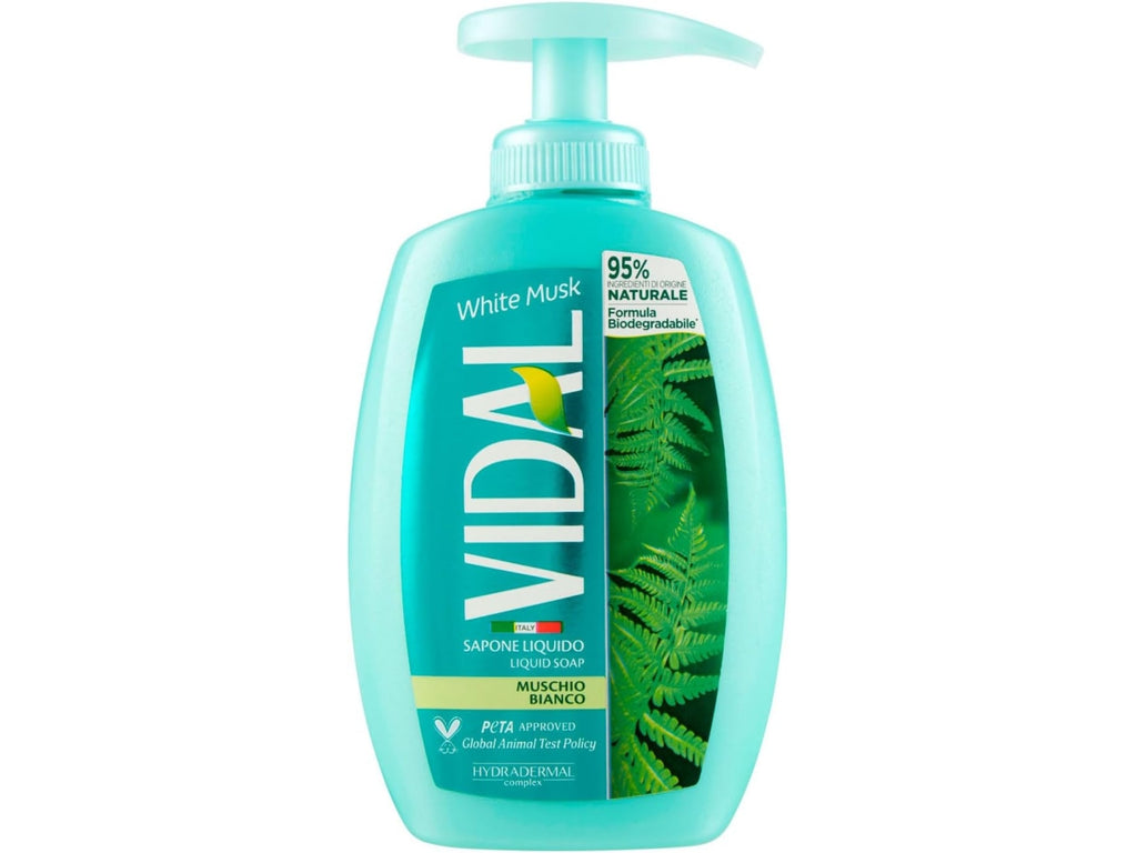 Lasciati avvolgere dallâintensità del muschio bianco del sapone liquido idratante di VIDAL! Realizzata con la tecnologia Hydradermal (un complesso di agenti dermocosmetici), la formula idrata, deterge e nutre intensamente la pelle rendendola morbida e setosa. Oltre alla sua azione penetrante e tonificante, amerai anche la sua freschezza e la sua intensità , tanto che non potrai più farne a meno. Per una sensazione di puro benessere e per un abbraccio caldo e seducente, scegli il sapone liquido VIDAL muschio bianco!