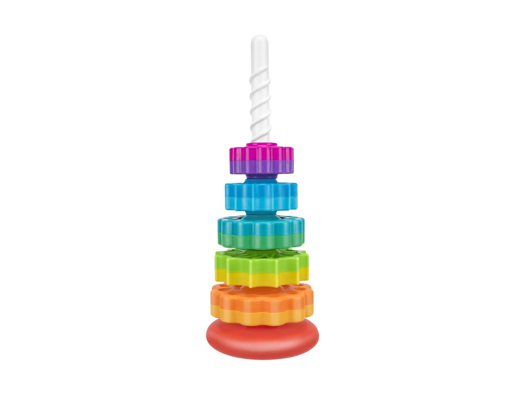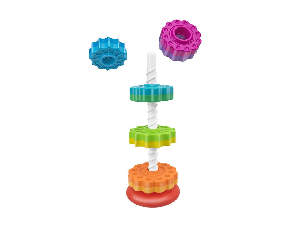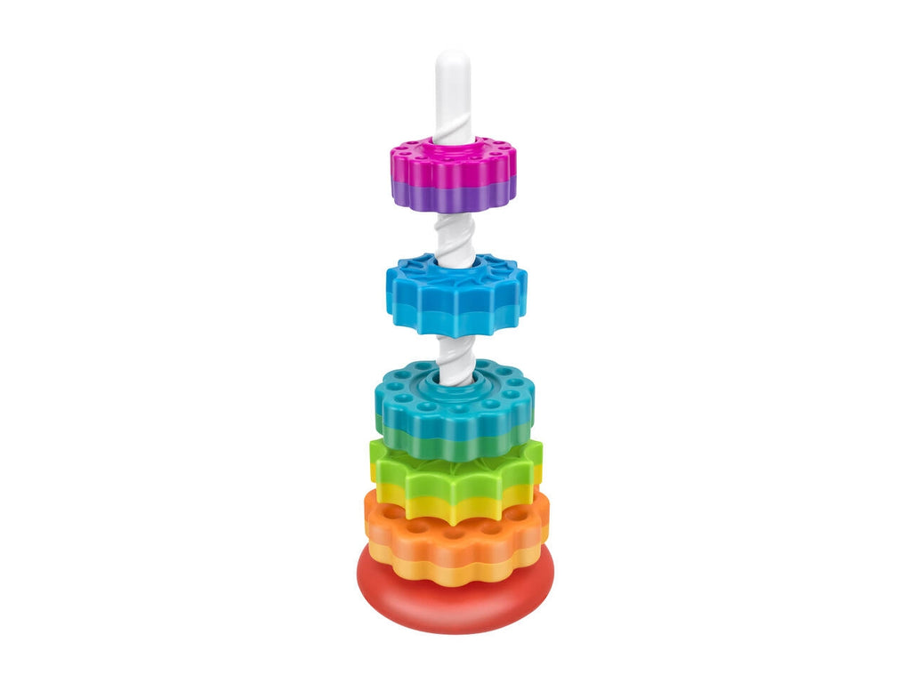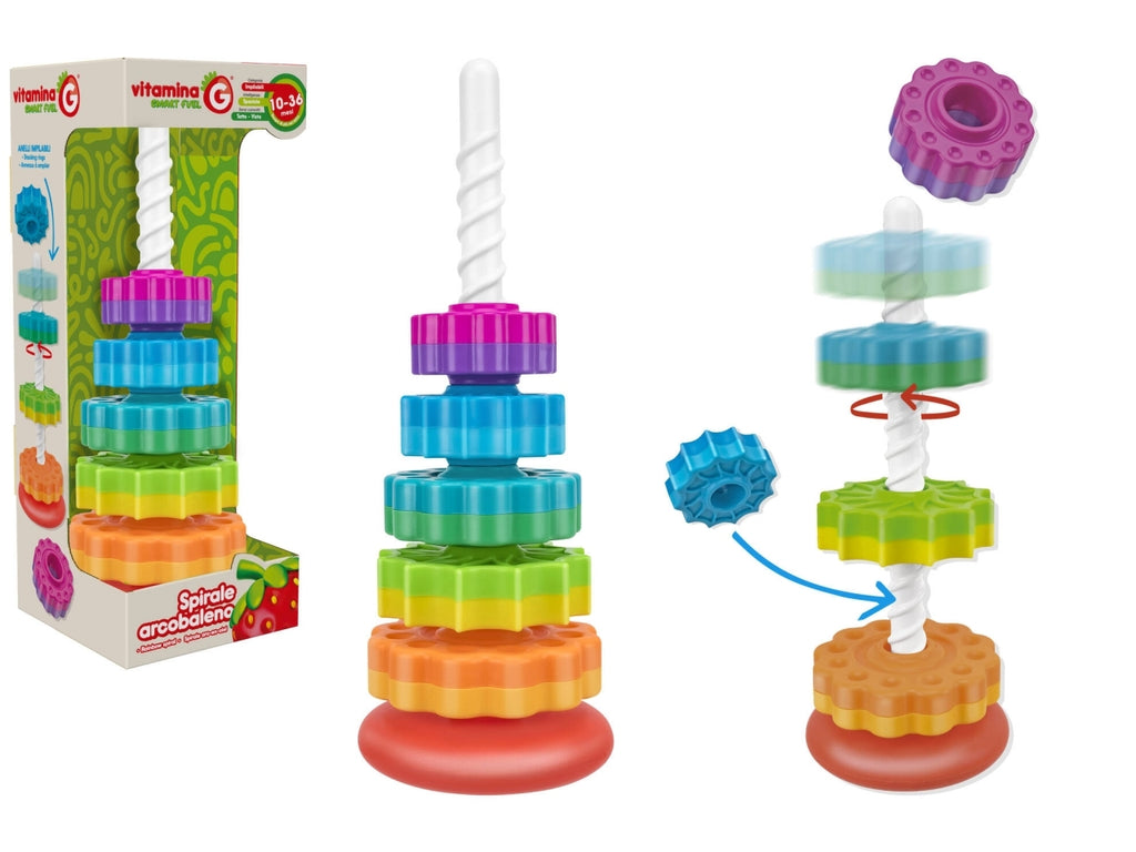 "Spirale Arcobaleno" è una colorata piramide con perno a vite in cui infilare secondo il corretto ordine le rotelle colorate. Un gioco per stimolare già nella prima infanzia la coordinazione occhio-mano e il senso spaziale dei bambini.