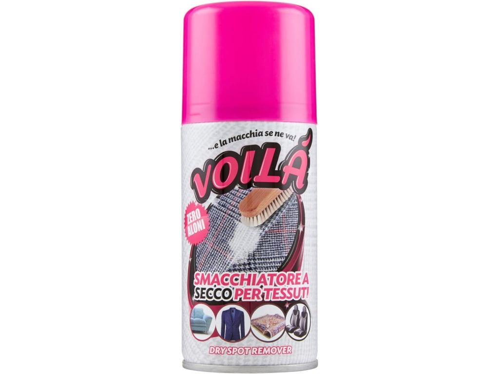 Voila e ideale quale pronto intervento smacchiante (anche fuori casa) e per pulire e smacchiare complementi non facilmente lavabili, come divani, poltrone, tappeti, moquette... consigliato anche su superfici pregiate come teak e pietra serena. grazie alla sua speciale micronizzazione, con un semplice gesto elimina a secco e allistante macchie di natura grassa (come sugo, unto, catrame), ma anche succo di frutta, trucco, inchiostro.utilizzato invece con acqua tiepida e sapone, rimuove efficacemente macchie di sudore, erba, latte, gelato, cioccolato, caffe etc il prodotto aumenta la sua efficacia se applicato a macchia ancora fresca.modalità  d'uso: agitare bene prima delluso. applicare il prodotto direttamente sulla macchia erogandolo da una distanza di circa 15/20 cm. lasciare agire per qualche minuto. quando si sara formata una polvere bianca e secca, spazzolare energeticamente per rimuovere il tutto, facendo attenzione a non rovinare il capo. per tessuti colorati o delicati, prov are prima in un angolo nascosto. se occorre, ripetere loperazione. come tutti gli smacchiatori a secco, anche voila non è indicato su maglie di lana e cashmere, su tessuti impermeabilizzati e capi in pelle.composizione contiene: idrocarburi c6