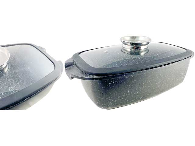 Rostiera rettangolare con impugnature e coperchio in vetro.