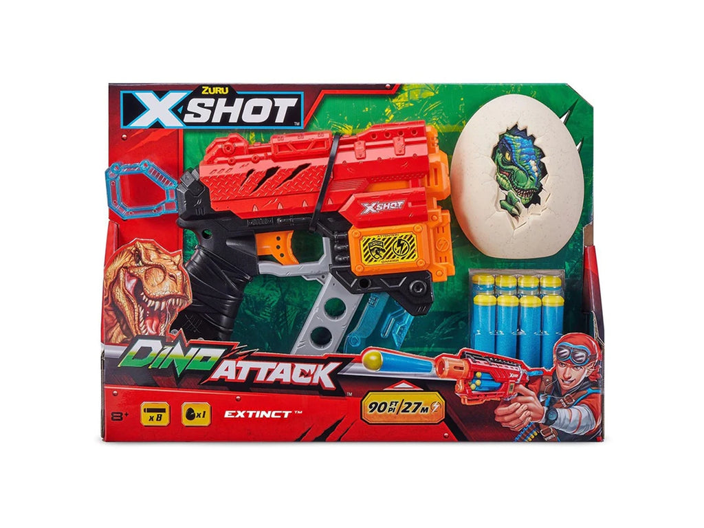 Preparati per l'invasione dei dinosauro con questa fantastica pistola x shot per proteggerti dalla furia dei dinosauri! questo giocattolo offre estrema precisione fino a 27 metri di distanza, una mini spada inclusa per combattere i mostri più audaci e, con il suo carico di munizioni, sarai pronto per la battaglia. usa il tuo uovo di dinosauro per esercitarti al bersaglio e preparati per l'azione!